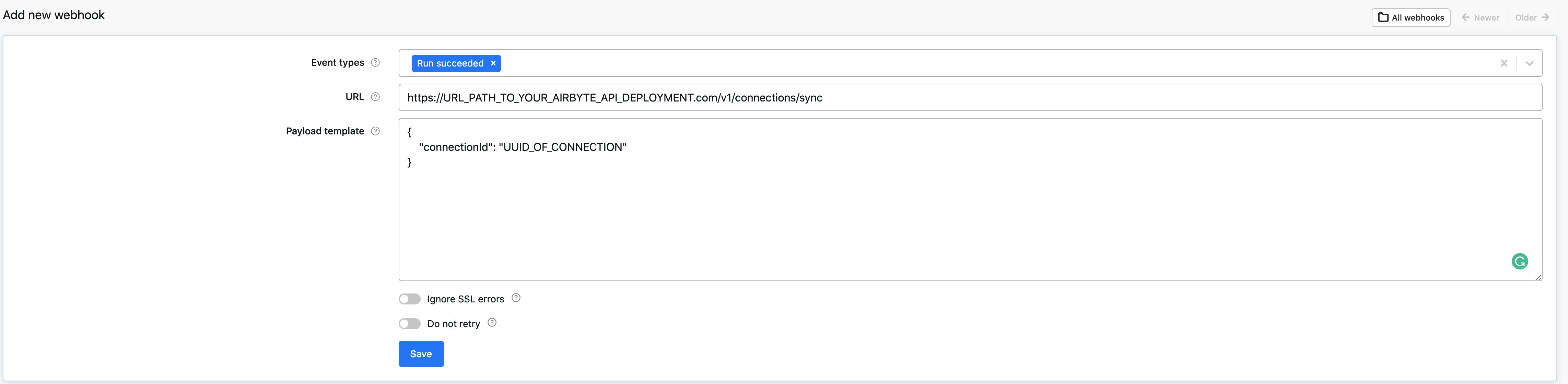 When your Apify job (aka Actor run) finishes, it can trigger an Airbyte sync by calling the Airbyte API manual connection trigger (POST /v1/connections/sync